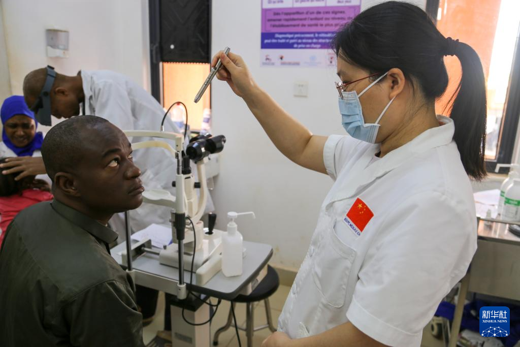 3月26日,在尼日尔综合示范医院眼科诊室,副主任医师文美丹为患者做眼部检查。新华社记者 司源 摄