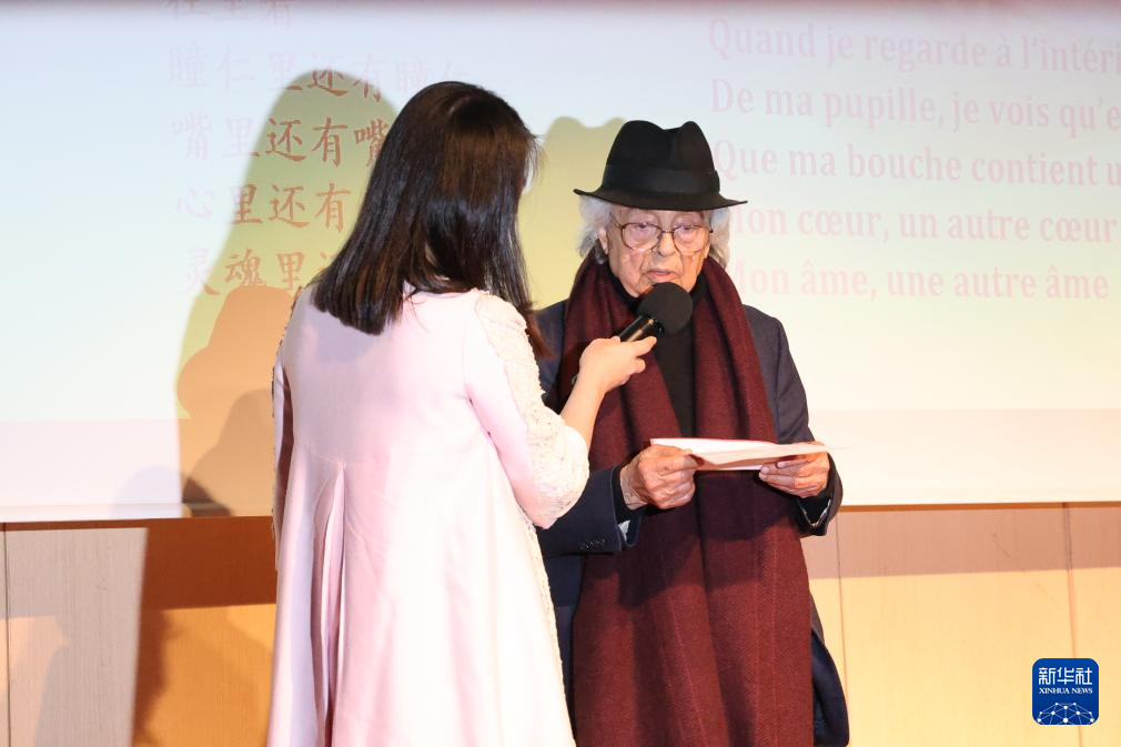 4月8日,在法国巴黎中国文化中心举办的“诗歌的邂逅——‘话中国’中法诗会”现场,叙利亚诗人阿多尼斯(右)用阿拉伯语朗读诗歌。新华社记者 张百慧 摄