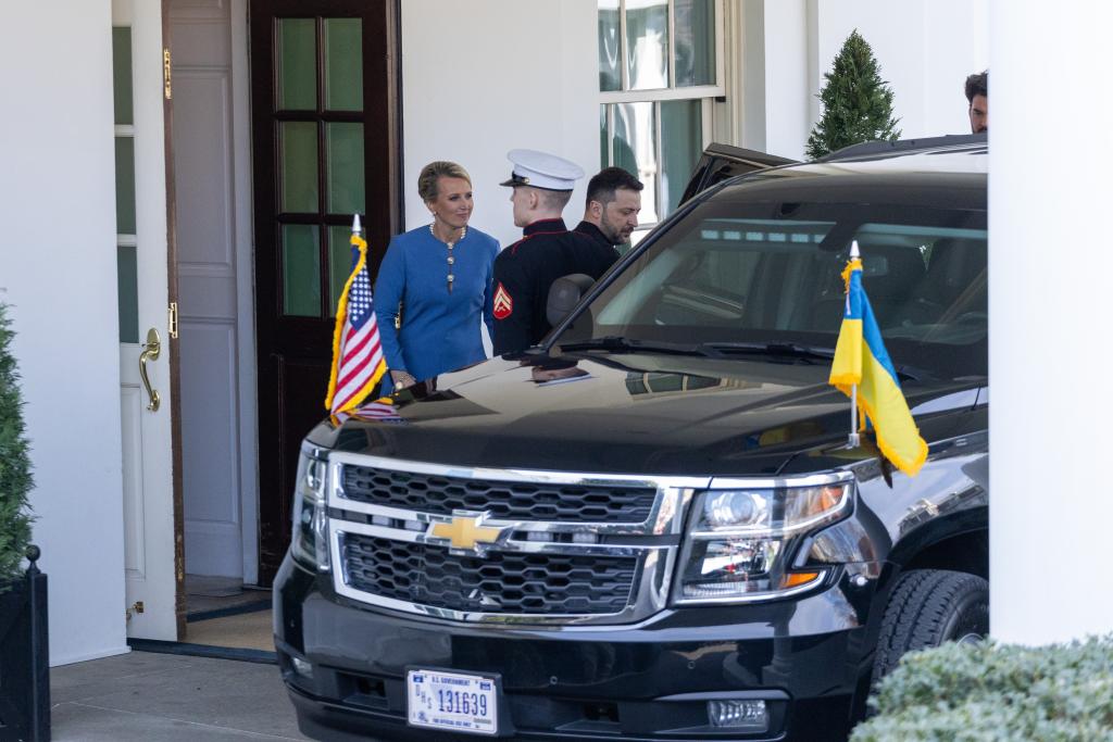2月28日,乌克兰总统泽连斯基(左三)离开美国华盛顿白宫。新华社记者胡友松摄