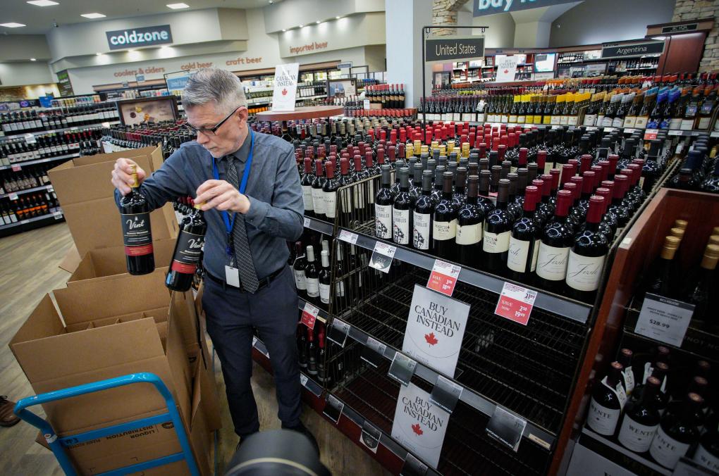 3月10日,在加拿大温哥华,一家不列颠哥伦比亚省酒类专卖店的店员从货架上撤下美国酒类产品。新华社发(梁森摄)