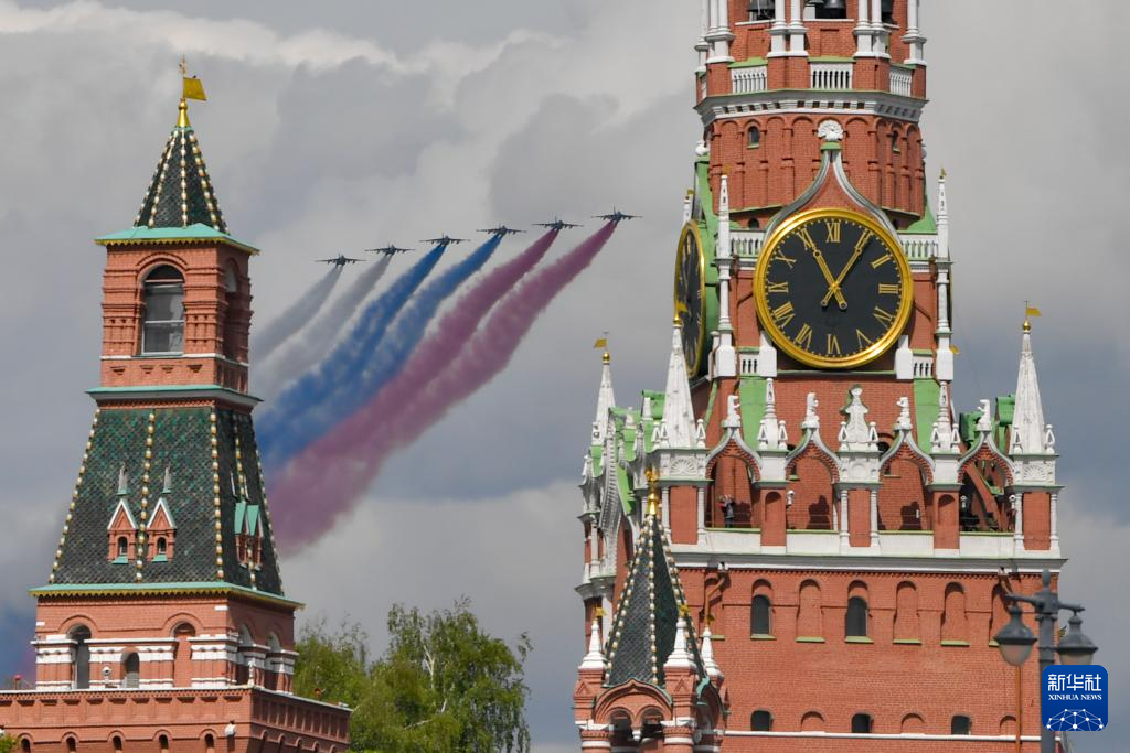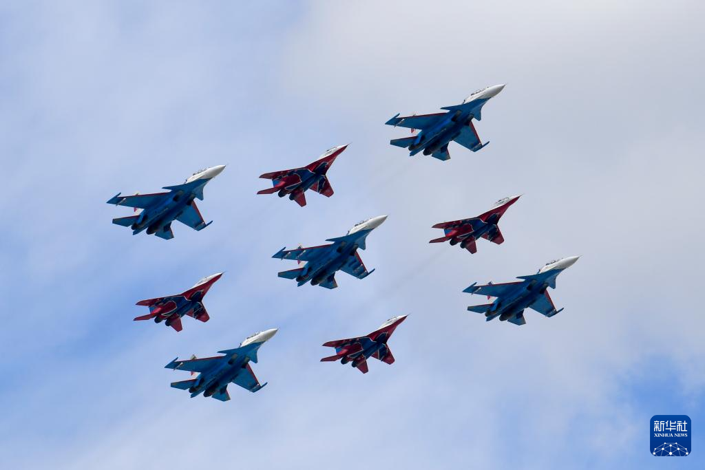 5月7日,在俄罗斯首都莫斯科,战机编队参加纪念苏联伟大卫国战争胜利80周年阅兵式彩排。
