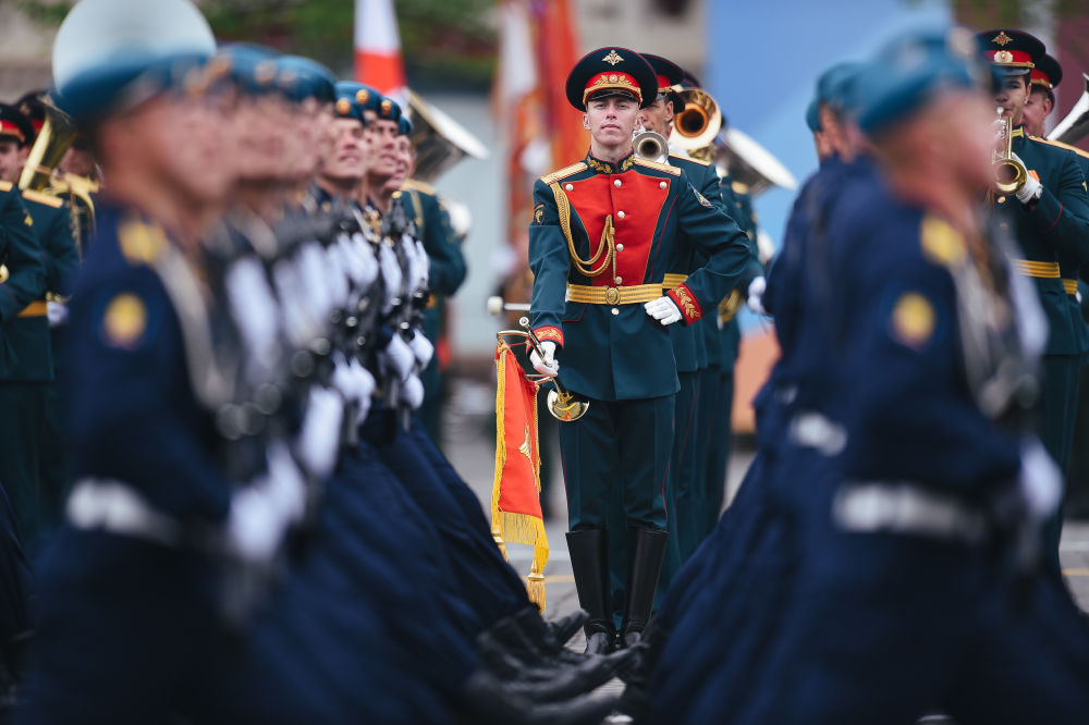 2022年5月9日,在俄罗斯莫斯科,军乐团准备参加纪念卫国战争胜利77周年阅兵式。新华社记者 白雪骐 摄