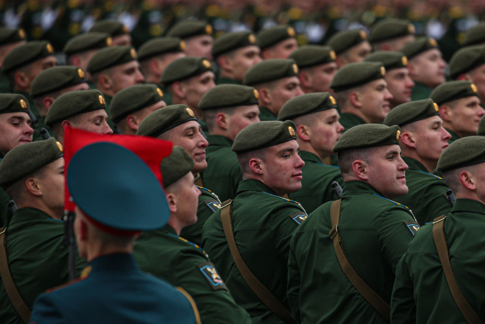 2019年5月9日,士兵在俄罗斯莫斯科举行的纪念卫国战争胜利74周年阅兵式上接受检阅。新华社发(叶甫盖尼·西尼岑摄)