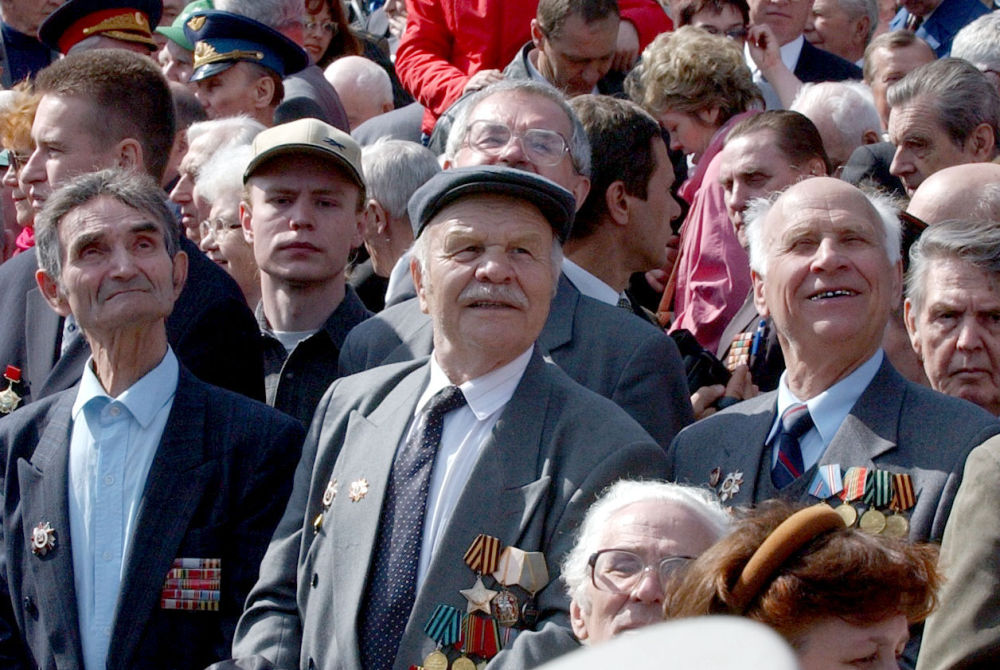 2003年5月9日,在俄罗斯莫斯科红场,几名老兵观看纪念卫国战争胜利58周年阅兵式。新华社记者张维革摄