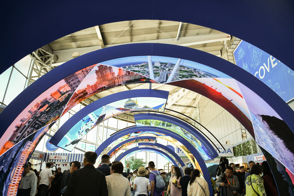 2024年5月18日,人们走进在哈尔滨国际会展中心举行的第八届中俄博览会展馆。