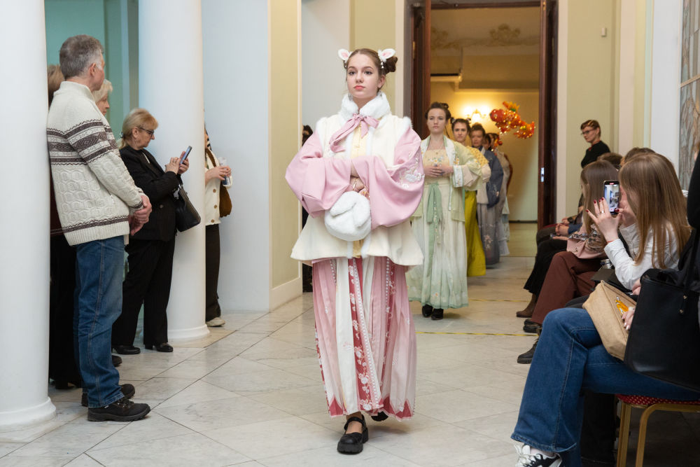 2023年1月30日,观众在俄罗斯圣彼得堡举行的庆祝中国春节活动上欣赏中式服装秀。