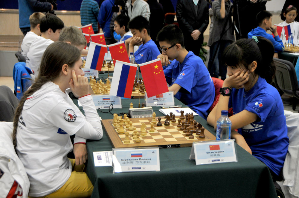 2014年11月7日,来自中国和俄罗斯的国际象棋青少年选手在“以棋会友”中俄国际象棋青少年友谊赛中对弈。