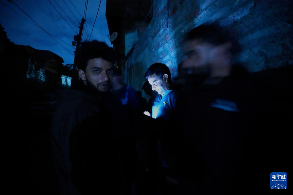 5月9日,在印控克什米尔斯利那加,一名男子停电期间用手机查看实时新闻。新华社/美联