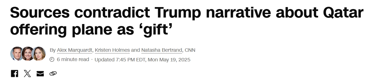 多名知情人士对美国有线电视新闻网记者说,特朗普政府首先与卡塔尔接洽,询问是否可以获得一架波音747飞机,用作总统专机。而按照特朗普本人的说法,卡塔尔主动提出把这架飞机作为“礼物”送给他。