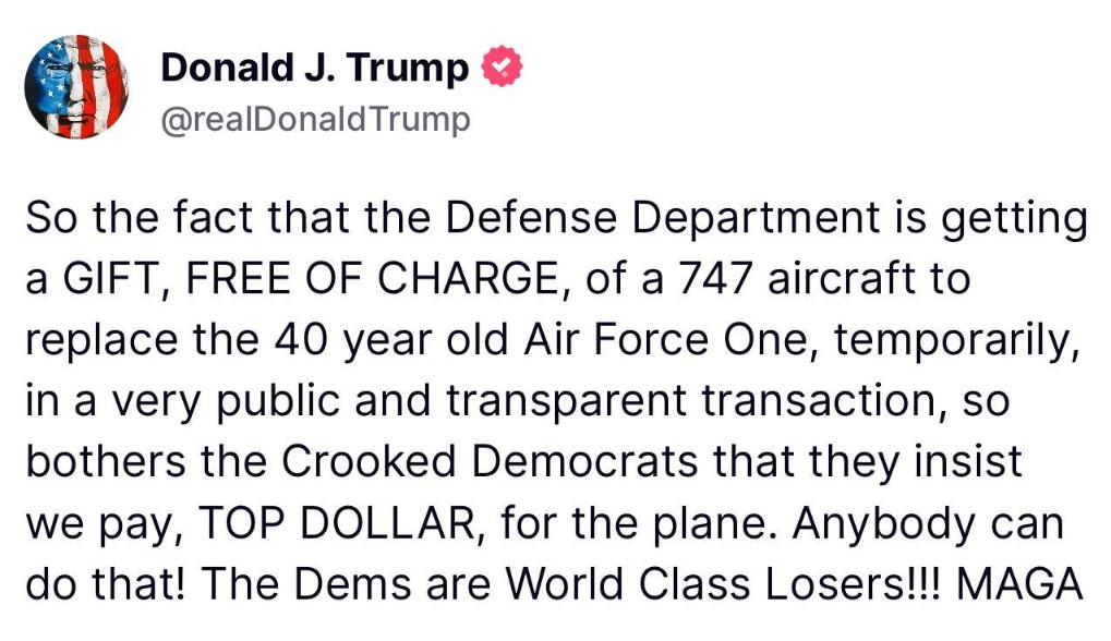 一名知情人士说,最初的讨论是向卡塔尔租飞机,后来五角大楼“提出购买飞机”,卡塔尔暗示愿意出售飞机。特朗普5月中旬在社交媒体网站“真实社交”上则写道:“礼物,免费的。”