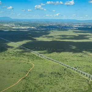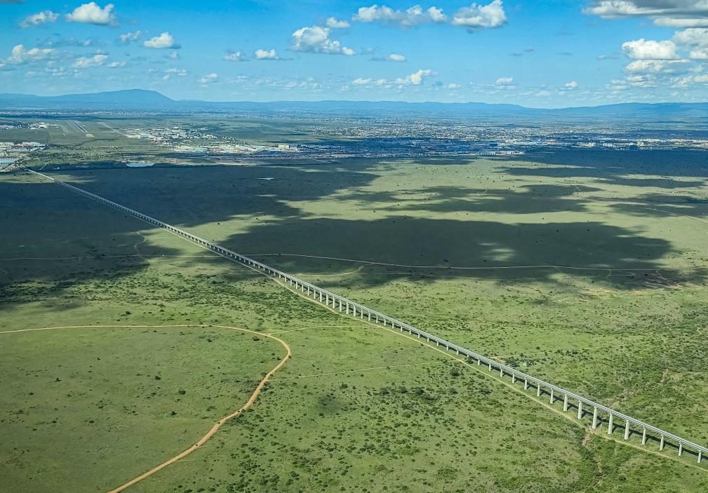 这是2025年4月27日在肯尼亚内罗毕国家公园上空拍摄的穿越公园的内马铁路一期大桥。新华社记者李亚辉摄