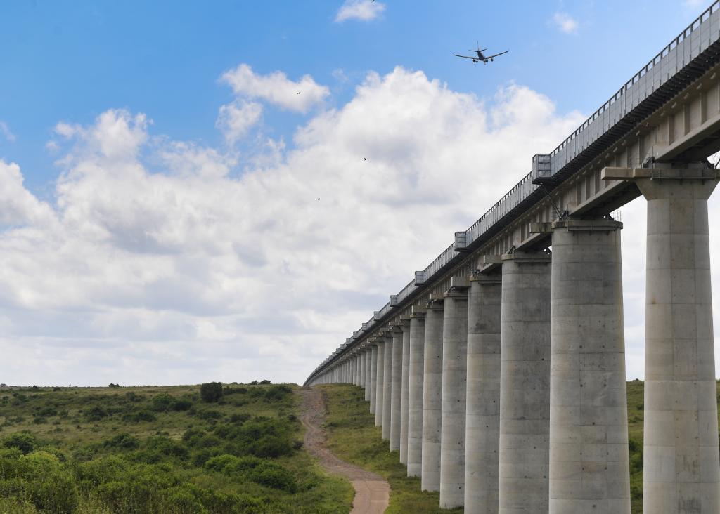图为2025年5月16日,在肯尼亚内罗毕国家公园,一架飞机飞过穿越公园的内马铁路一期大桥上空。新华社记者李亚辉摄