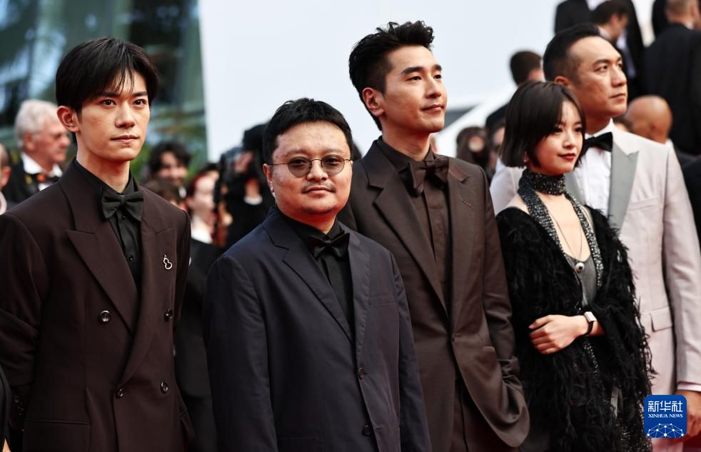 5月24日,在法国南部小城戛纳,中国影片《狂野时代》主创人员踏上闭幕式红毯。新华社记者 高静 摄