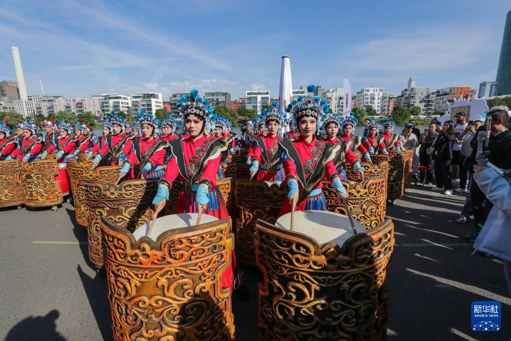 5月24日,演员在第二届德国法兰克福国际龙舟友谊赛期间表演中国陕西神木杨家将战鼓。新华社记者 张帆 摄