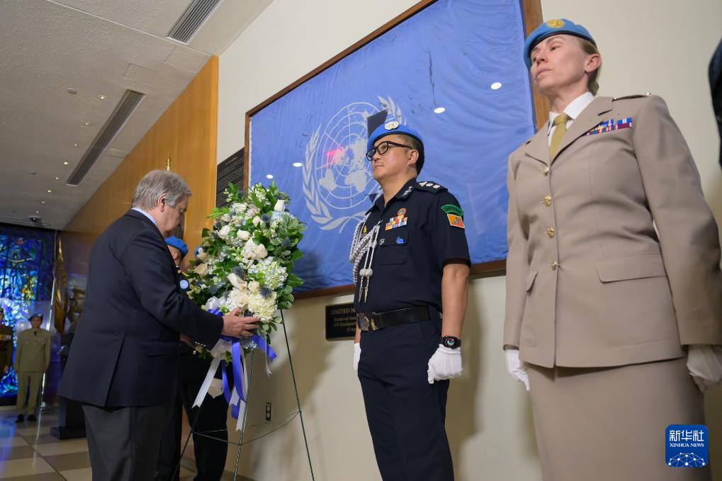 5月29日,在位于纽约的联合国总部,联合国秘书长古特雷斯(左)在纪念仪式上向殉职维和人员敬献花圈。新华社发(联合国供图/曼努埃尔·埃利亚斯摄)