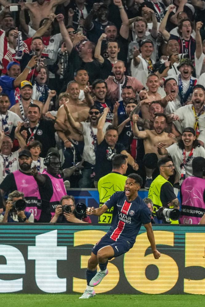 5月31日,巴黎圣日耳曼队球员马尤卢(前)在欧冠联赛决赛进球后庆祝。新华社记者 彭子洋 摄