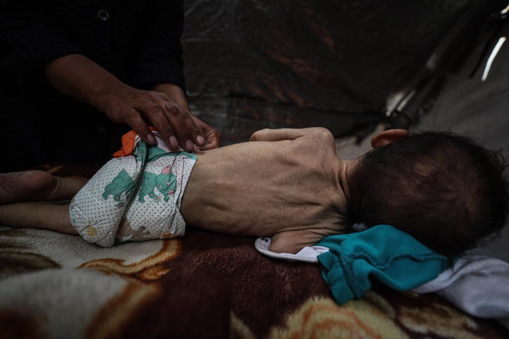 这是5月28日在加沙城西部一处临时安置点拍摄的一名营养不良的婴儿。新华社发(马哈茂德·扎基摄)