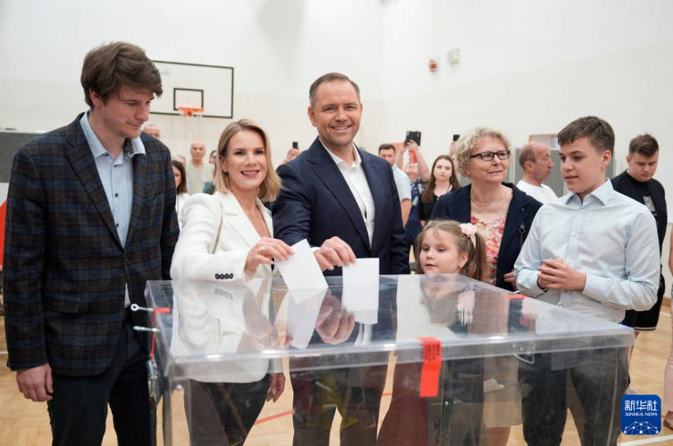 6月1日,独立候选人卡罗尔·纳夫罗茨基(左三)和家人在波兰首都华沙一处投票站投票。波兰1日举行总统选举第二轮投票。新华社发(亚普·阿林摄)
