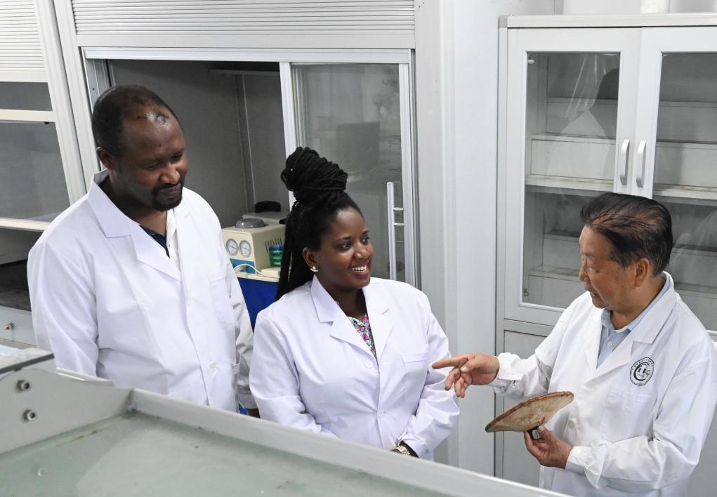 2024年8月26日,林占熺教授(右)在福建农林大学向卢旺达留学生介绍菌草栽培灵芝技术。二十世纪八十年代,福建农林大学教授林占熺发明了菌草技术。如今,菌草技术以培训、教育、合作与援助等方式在40余个非洲国家落地生根,持续在这片土地上播撒希望和友谊。新华社记者 林善传 摄