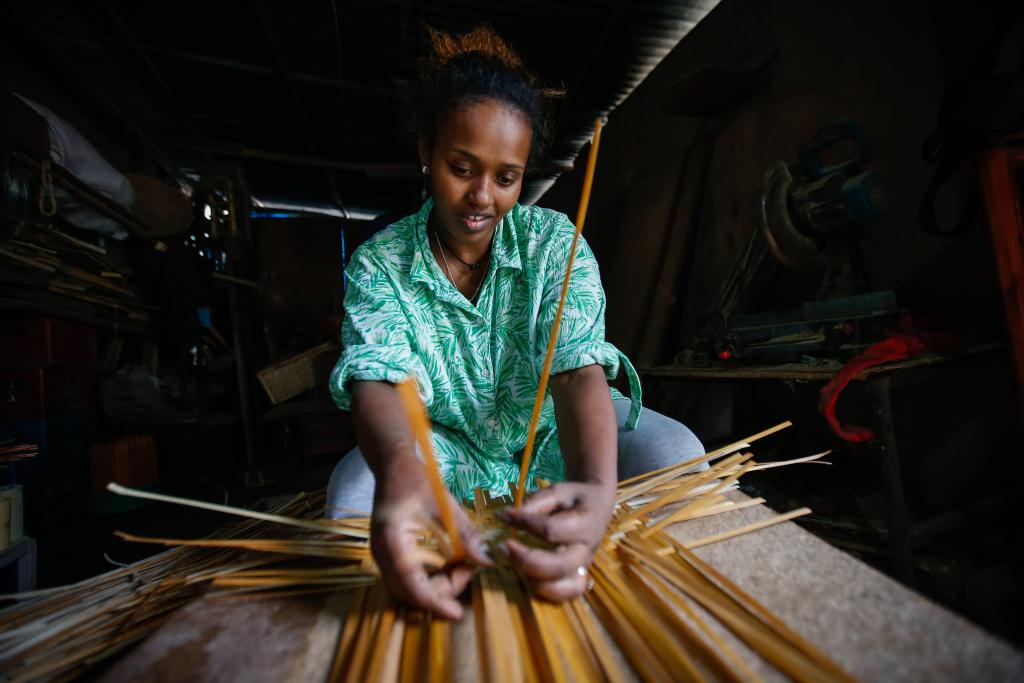 2024年8月10日,菲基尔特·加布雷在埃塞俄比亚首都亚的斯亚贝巴名为“绿色金子”的竹藤工作室里加工竹制产品。新华社发(迈克尔·特韦尔德 摄)