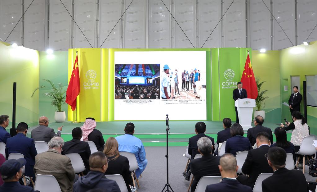 这是2024年12月6日在沙特阿拉伯利雅得《联合国防治荒漠化公约》第十六届缔约方大会(COP16)中国馆拍摄的以“中国‘绿色长城’走向世界”为主题的边会现场。新华社记者 王东震 摄