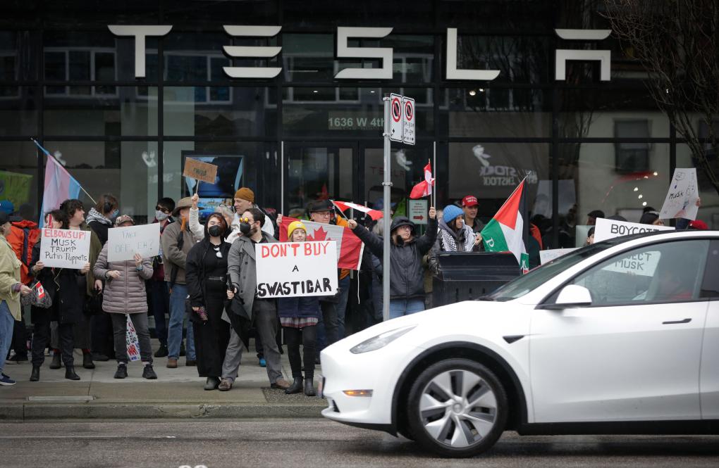 3月29日,一辆特斯拉汽车驶过加拿大温哥华一家特斯拉经销门店外的抗议活动现场。新华社发(梁森摄)