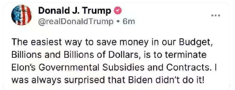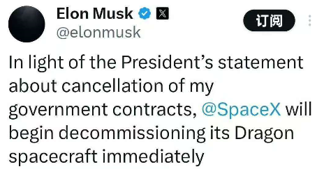 特朗普5日在社交媒体上写道:“要在预算中节省数十亿美元最简单的方法就是终止马斯克的政府补贴和合同。”马斯克随后反击说:“SpaceX将立即让其“龙”飞船退役。”