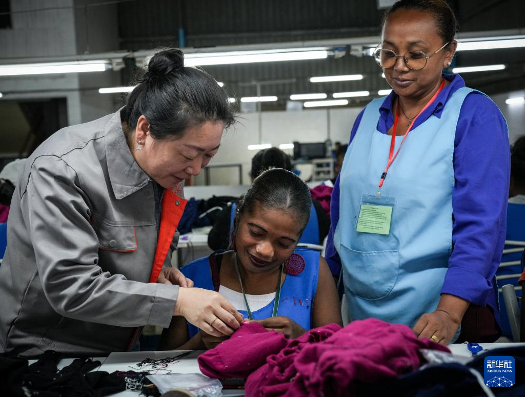 3月28日,在马达加斯加塔那那利佛的内蒙古鹿王羊绒有限公司马达加斯加工厂,一名中方人员为当地工人进行技术指导。新华社记者 李亚辉 摄