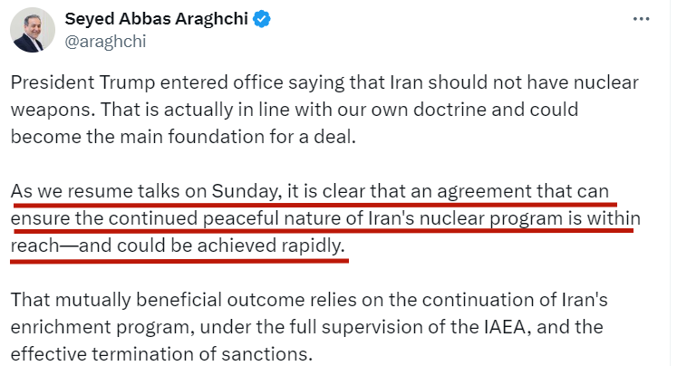 阿拉格齐在帖文中写道,特朗普说伊朗不应拥有核武器,这实际上与伊朗自身的原则一致。