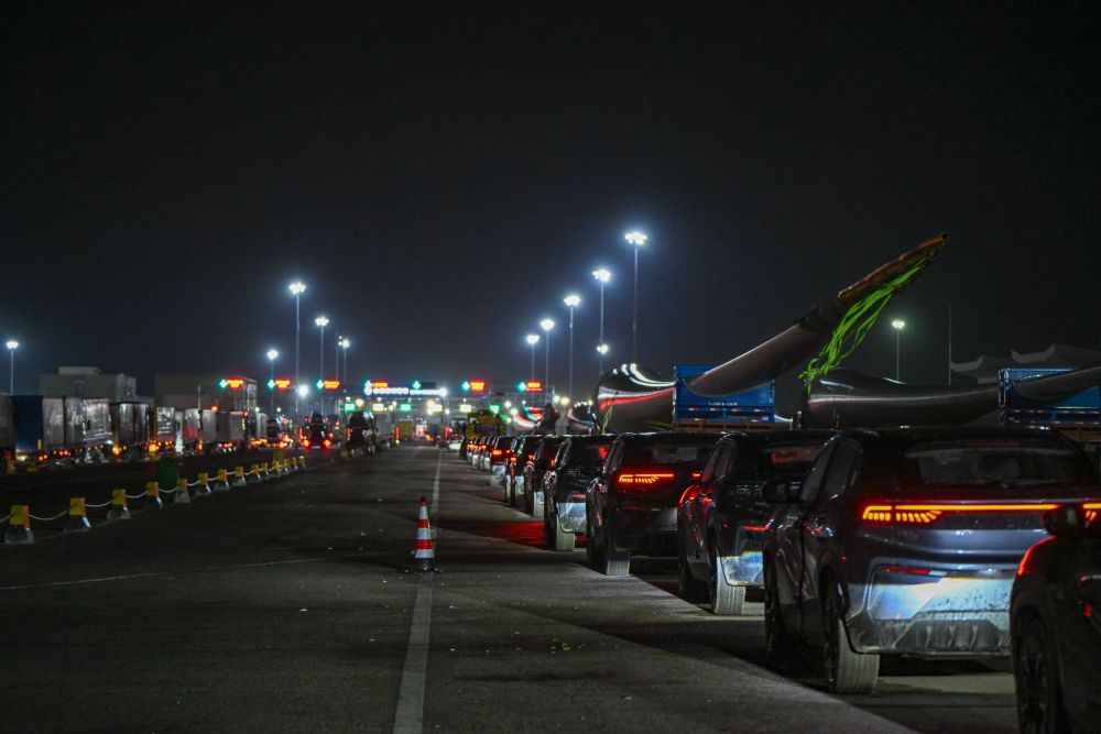↑从白天到深夜,国门前等待出口的车辆络绎不绝。