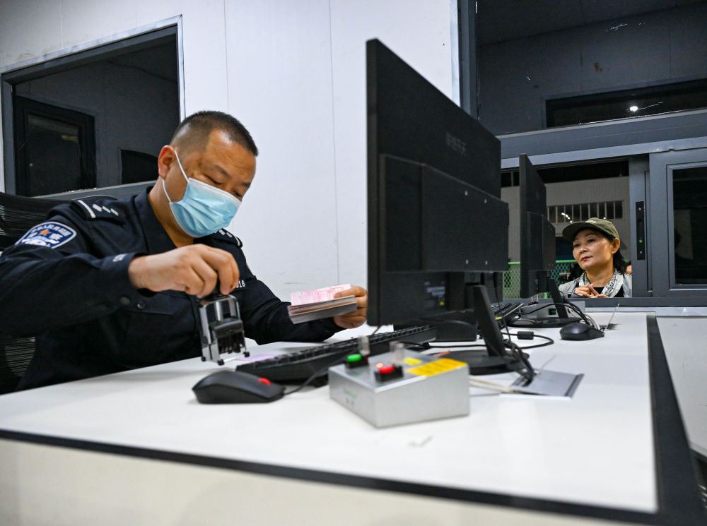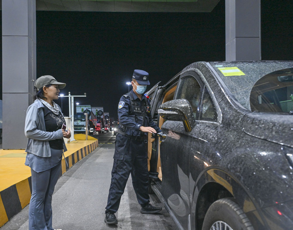 ↑凌晨,在霍尔果斯公路口岸,移民管理警察为高云办理出入境边防检查手续。
