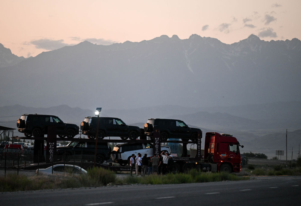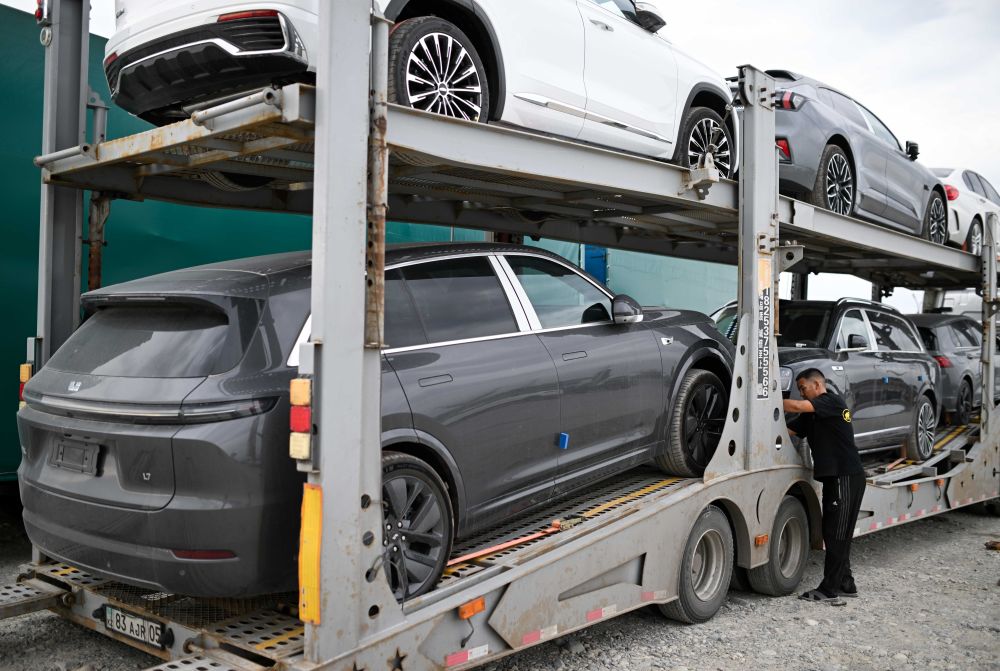 ↑在扎尔肯特镇的中转停车场,运输公司工作人员装载从中国进口的新能源汽车。