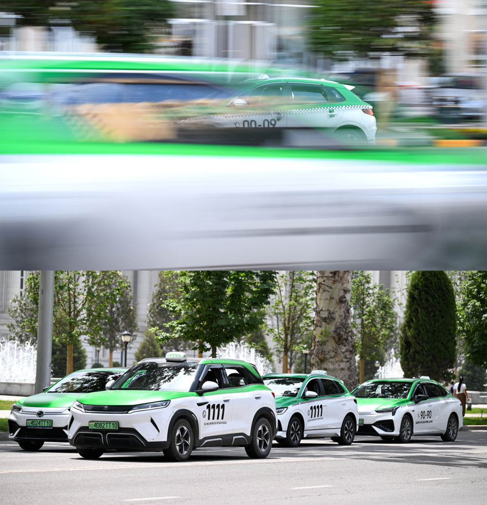 ↑在塔吉克斯坦首都杜尚别,绝大多数出租车都选用中国新能源汽车,司机们谈起自己的爱车都赞不绝口(拼版照片)。
