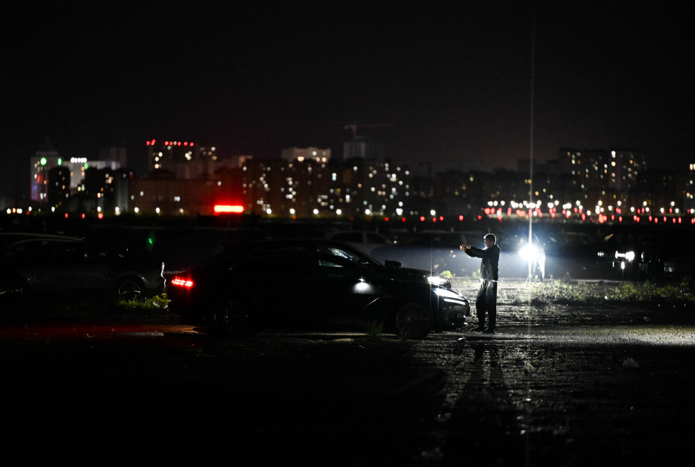 ↑停好车后,汽车“摆渡人”的第一件事是把车辆交由运输公司的验车人验收。这是验车人在哈方停车场验车。远处是霍尔果斯夜景。