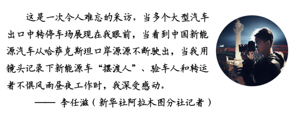 ↑在扎尔肯特镇的中转停车场,运输公司工作人员在查看从中国进口的新能源汽车的手续。