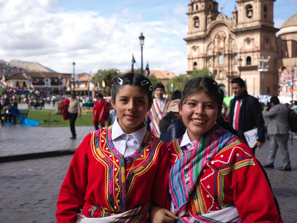 6月20日,在秘鲁库斯科的武器广场上,身着传统服饰的姑娘朝镜头微笑。(新华社记者赵凯摄)