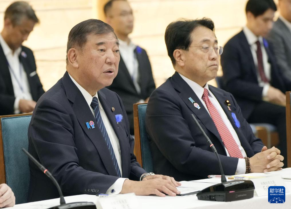 7月8日,在日本东京,日本首相石破茂(左)在综合对策总部会议上发言。新华社/共同社
