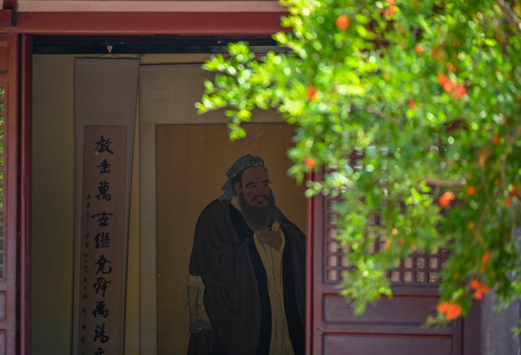 尼山孔庙及书院景区的孔子像(5月21日摄)。新华社记者 陈朔 摄