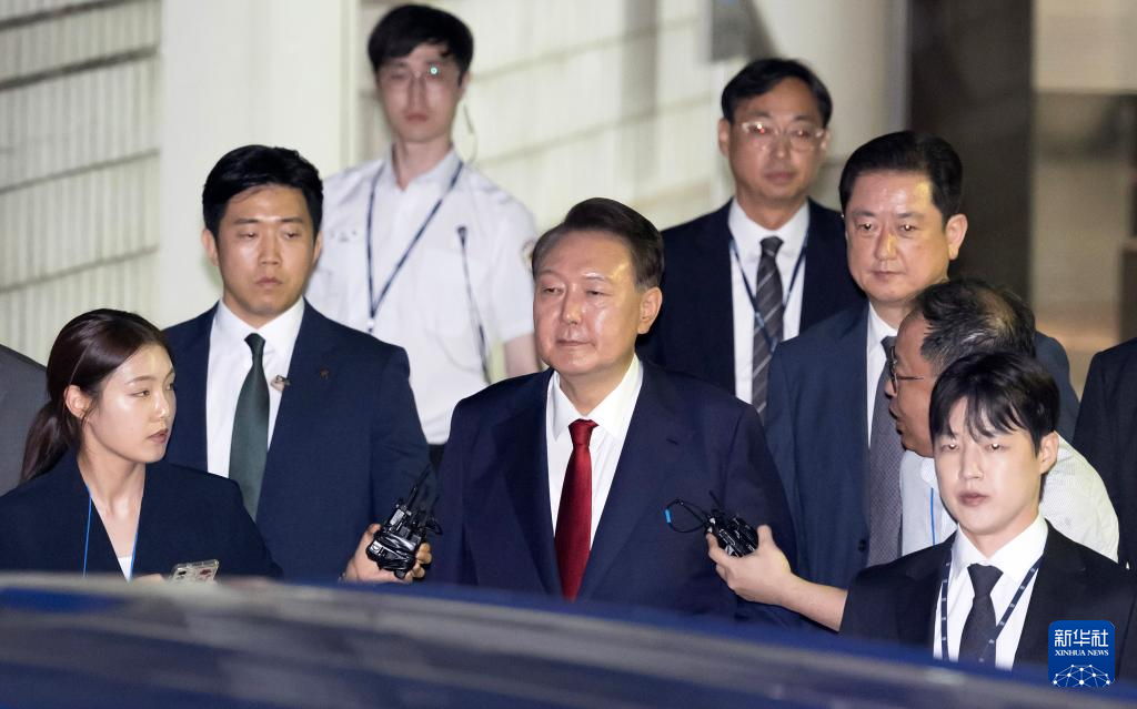7月9日晚,韩国前总统尹锡悦接受讯问后走出首尔中央地方法院。新华社/纽西斯通讯社