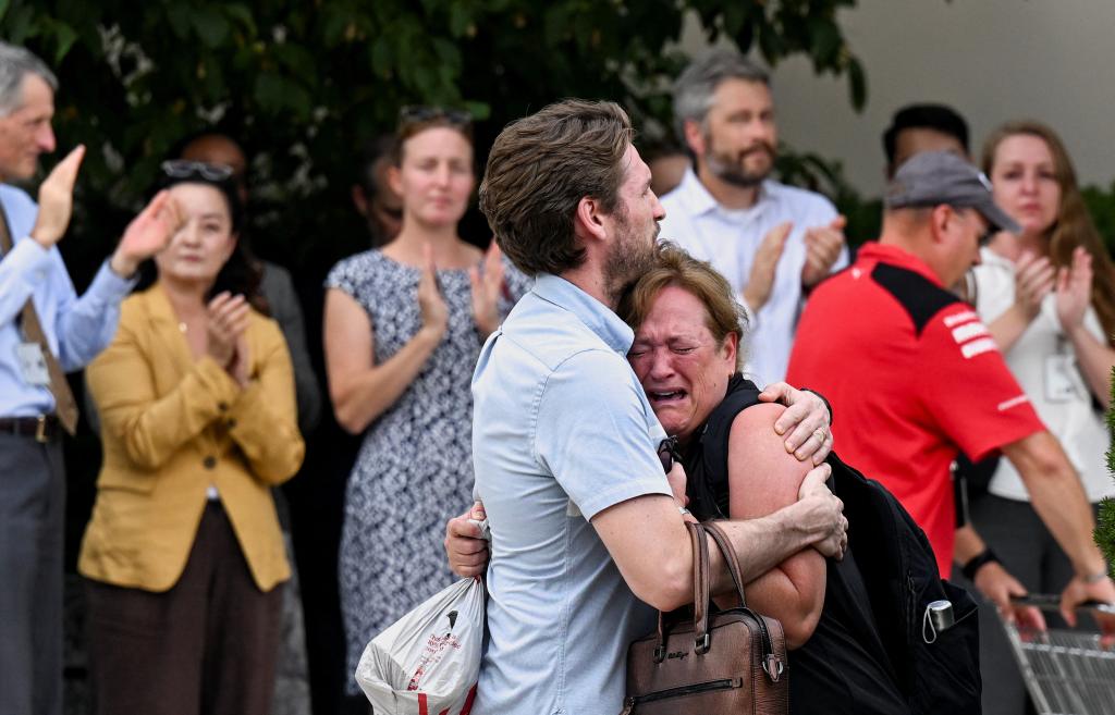 7月11日,在位于华盛顿的美国国务院总部外,一名男子安慰一名女子。新华社/路透