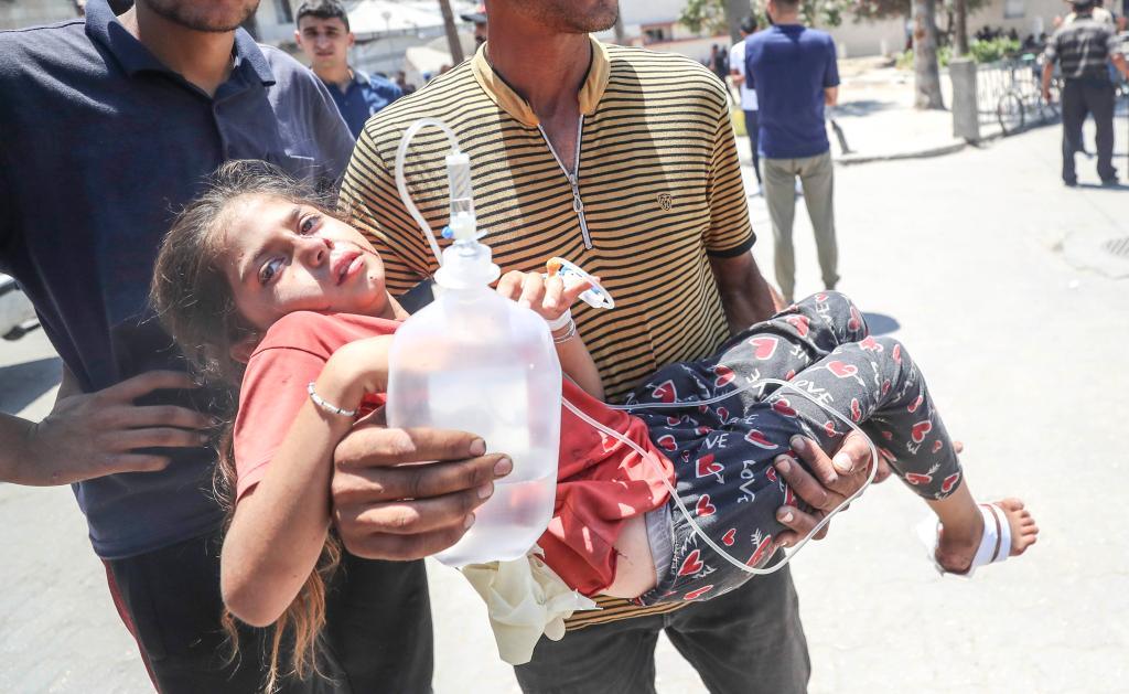 7月13日,在加沙城一所医院,一名男子怀抱在以军空袭中受伤的女孩。新华社发(马哈茂德·扎基摄)