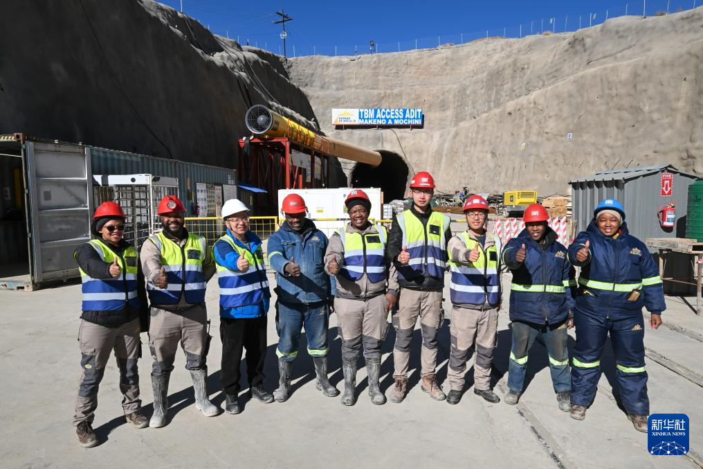 7月7日,在位于莱索托东部莫霍特隆地区的波利哈利输水隧洞建设项目施工现场,中国、莱索托两国的建设者合影。新华社记者 杨光 摄