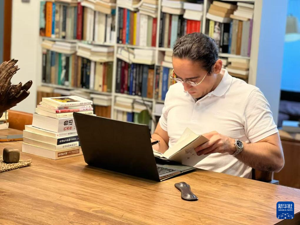 巴西汉学家沈友友2024年在家中准备工作资料。 新华社发