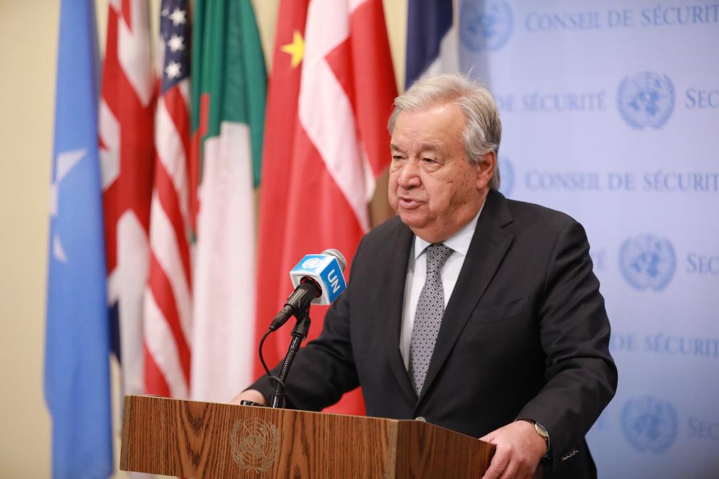 5月5日,在位于纽约的联合国总部,联合国秘书长古特雷斯在记者见面会上讲话。新华社记者谢锷摄