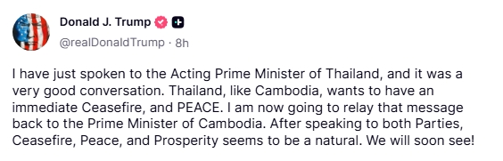 特朗普26日在社交媒体上说,他当天分别与柬埔寨首相洪玛奈、泰国代理总理普坦通电话,称两国只有结束边境冲突,美国才会考虑与两国达成贸易协议。