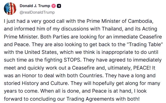 特朗普表示,美国与泰国和柬埔寨都有贸易往来,如果两国正在冲突,美国不想与两国达成任何协议。“当一切尘埃落定,和平即将到来时,我期待与这两个国家达成贸易协议。”特朗普还称,泰柬两国领导人同意“立即会面并迅速达成停火协议”,并希望与美国重回“贸易谈判桌”。