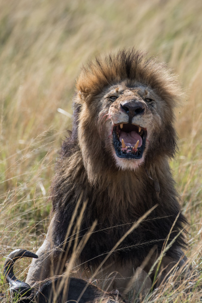 ↑在肯尼亚马赛马拉国家保护区,刚成功捕获一只角马的雄狮在大草原上吼叫。