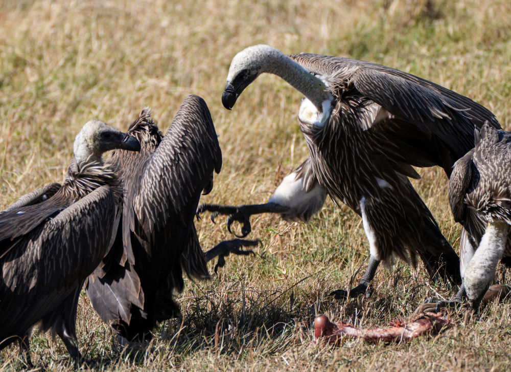 ↑在肯尼亚马赛马拉国家保护区,秃鹫争夺食物。