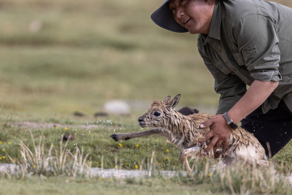 ↑管护队员救助一只被激流冲走的藏羚羊幼崽。
