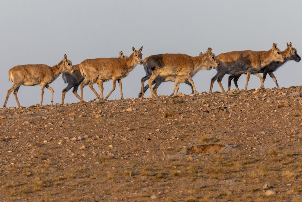 ↑一群雌性藏羚羊在羌塘国家级自然保护区核心区内进行繁殖迁徙。